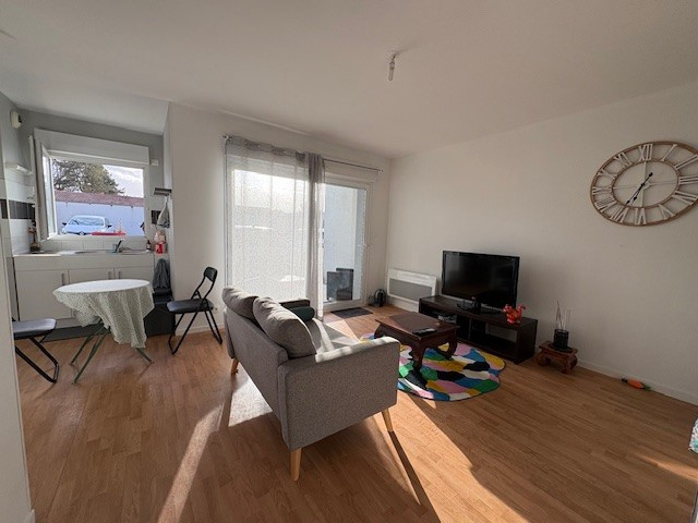 Séjour avec partie cuisine ouverte, dégagement, une chambre avec placards, salle de bains et WC.