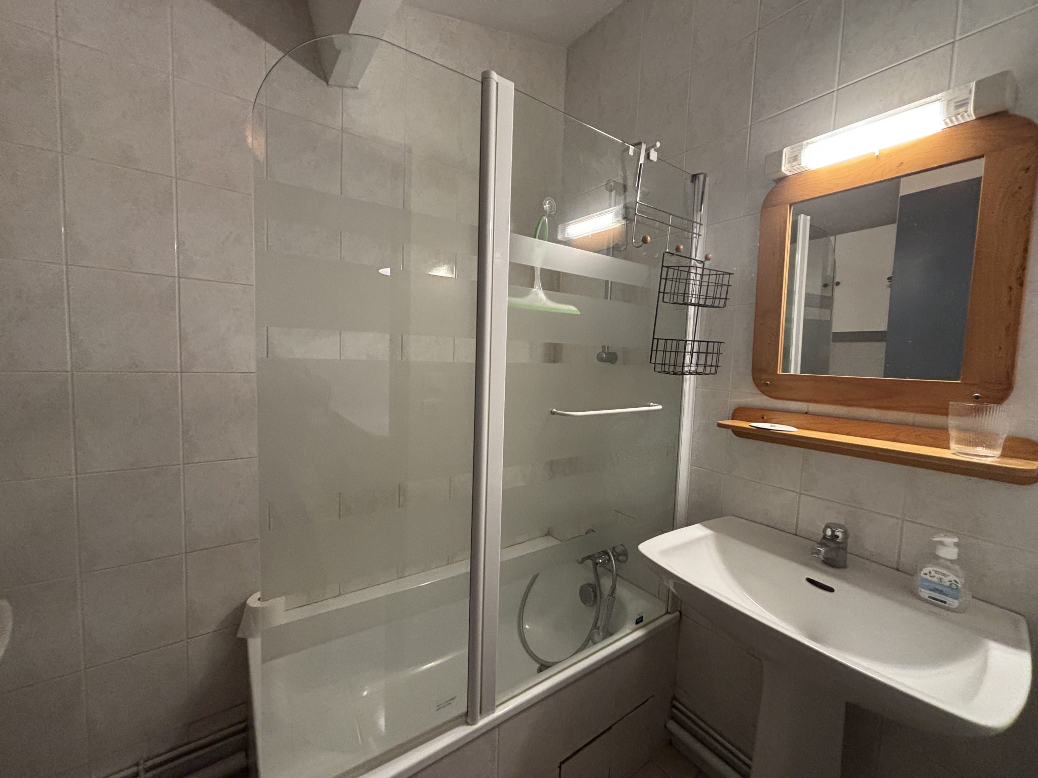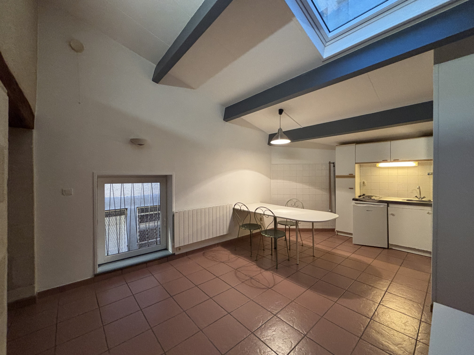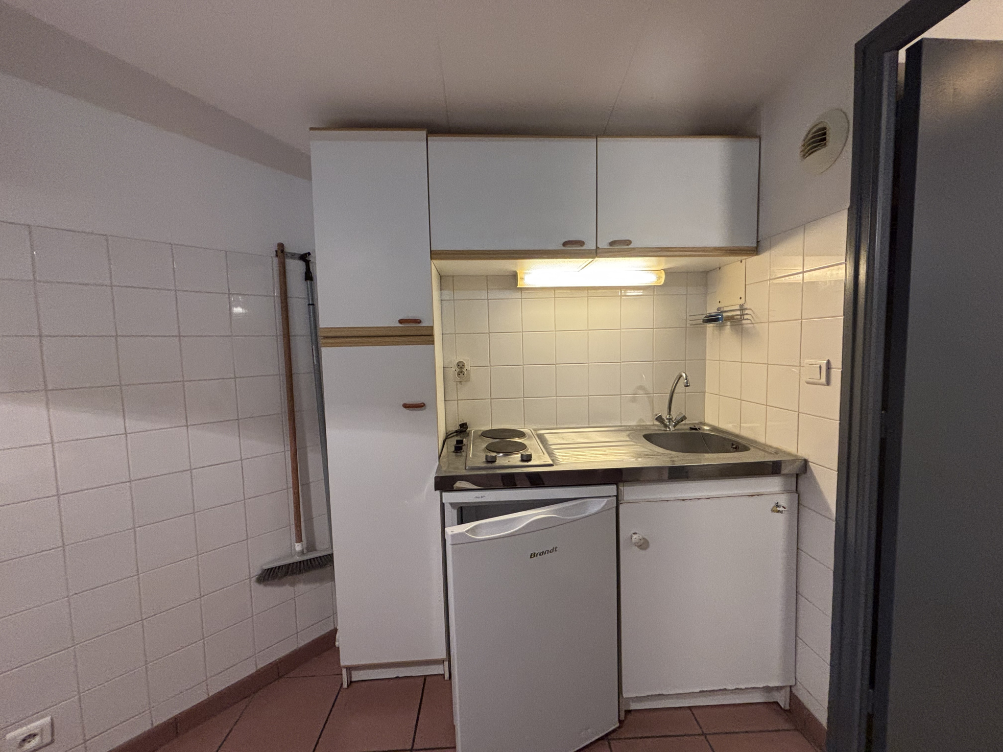 Une entrée, une pièce de vie avec cuisine aménagée, une grande chambre avec placard, une salle de bain avec wc.