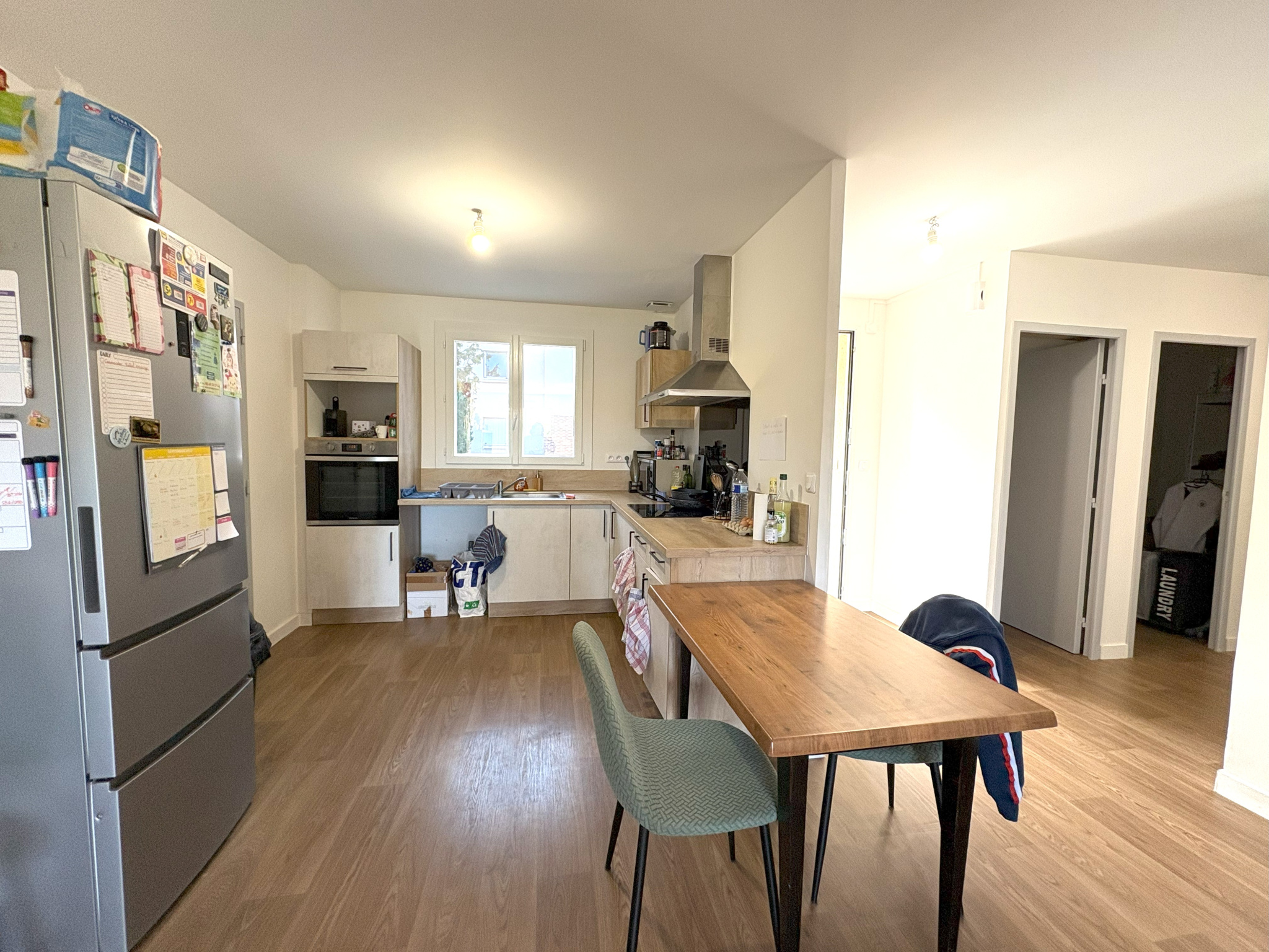 une entrée avec placard, une cuisine aménagée, un grand séjour, 2 chambres, une salle de bains, un wc, une buanderie.