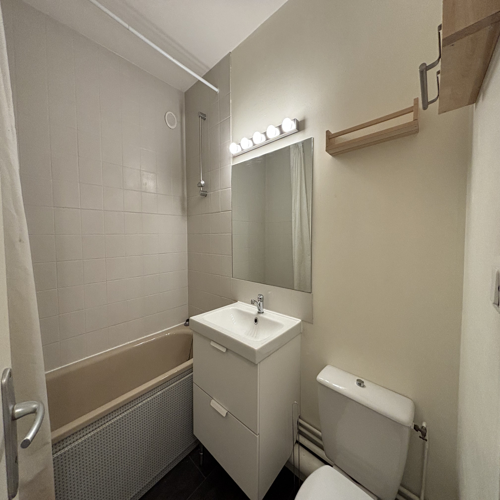 Dans une résidence sécurisée, un studio meublé de 26m2 au 1er étage comprenant une entrée avec placard, une pièce de vie, une kitchenette, une salle de bains avec wc.