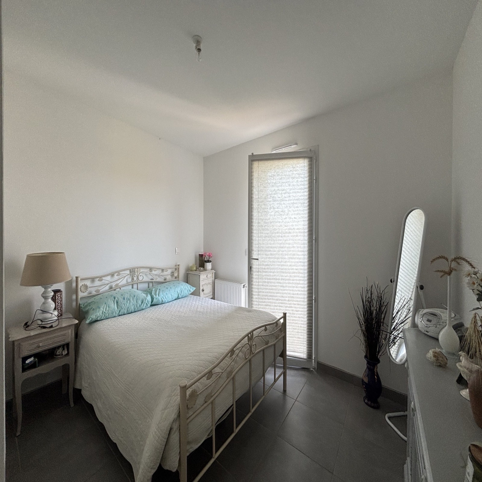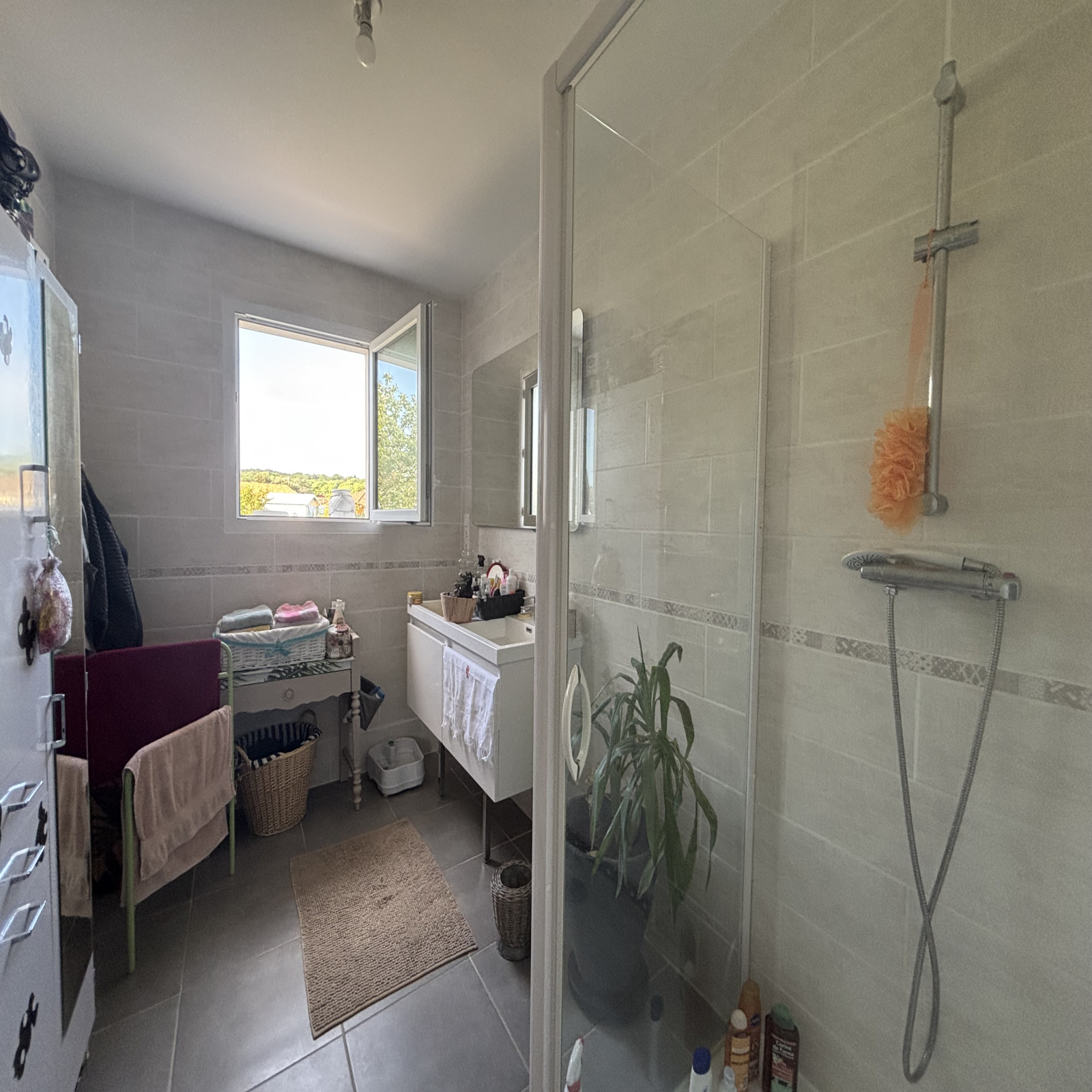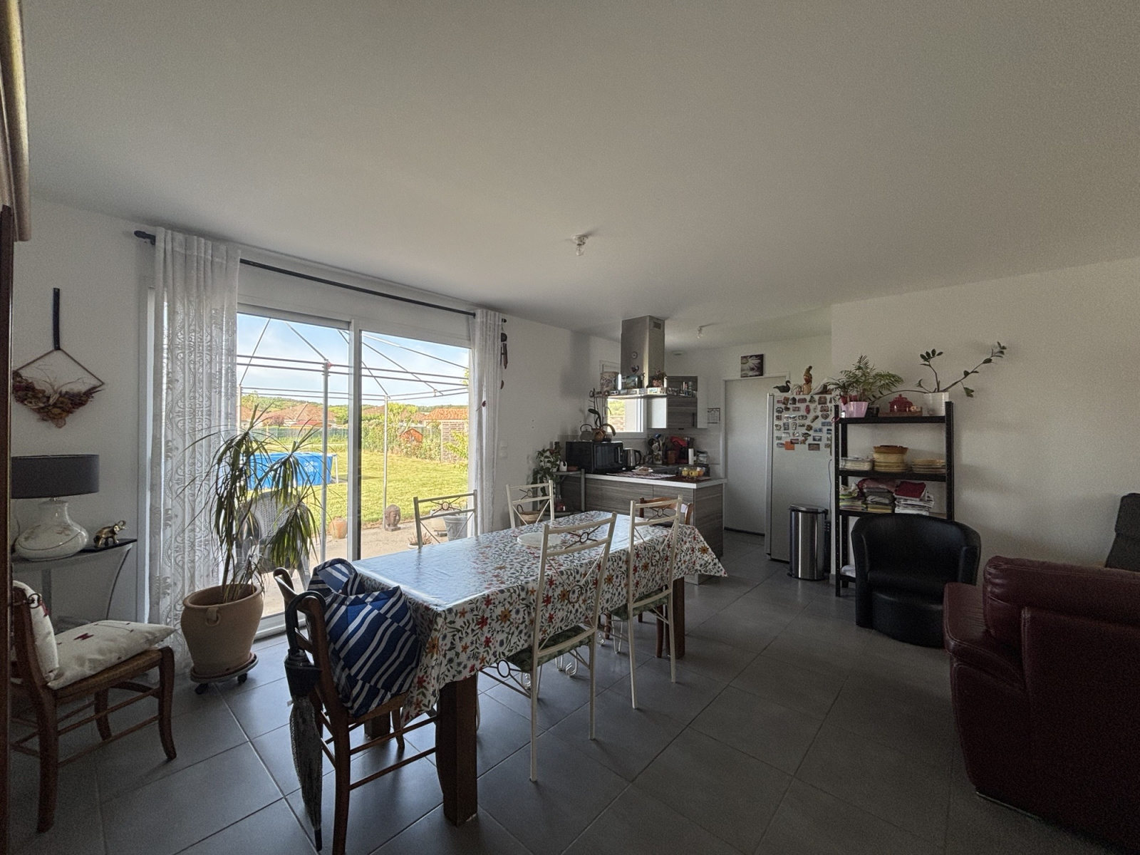 un séjour/salon donnant sur une terrasse, une cuisine ouverte aménagée et équipée (plaque de cuisson, four et hotte), un cellier, 3 chambres avec placards aménagés, une salle d'eau, un wc, un garage.
