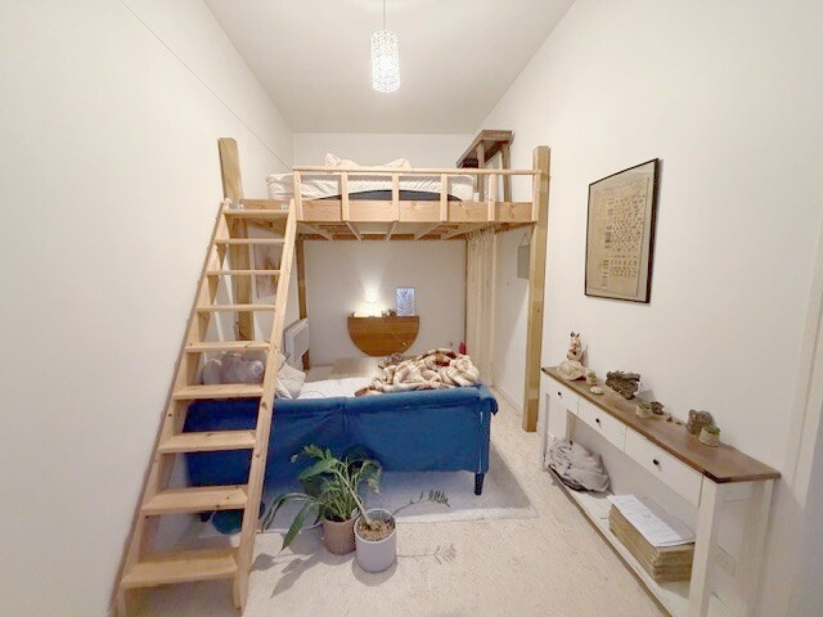 Il se compose, d'une entrée sur un séjour avec mezzanine, un coin cuisine avec kitchenette, une chambre avec placard et une salle d'eau avec WC.